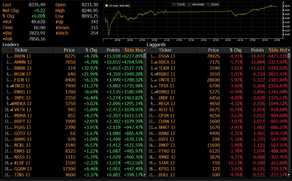 IHSG ditutup flat ke level 8,235 pada perdagangan Jumat (27/02). Indeks rebound terbatas pasca bergerak volatil dengan pergerakan 8,094 - 8,247. Pergerakan IHSG didorong oleh saham BREN, AMMN, dan BNBR, sementara saham yang membebani indeks yaitu DSSA, BBCA, dan TLKM.