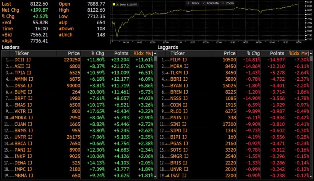 IHSG ditutup menguat 2.52% ke level 8,123 pada perdagangan Selasa (03/02). Indeks sempat sentuh lowest 7,889 namun berhasil rebound hingga akhir sesi. Penguatan IHSG didorong oleh saham DCII, ASII, dan TPIA.