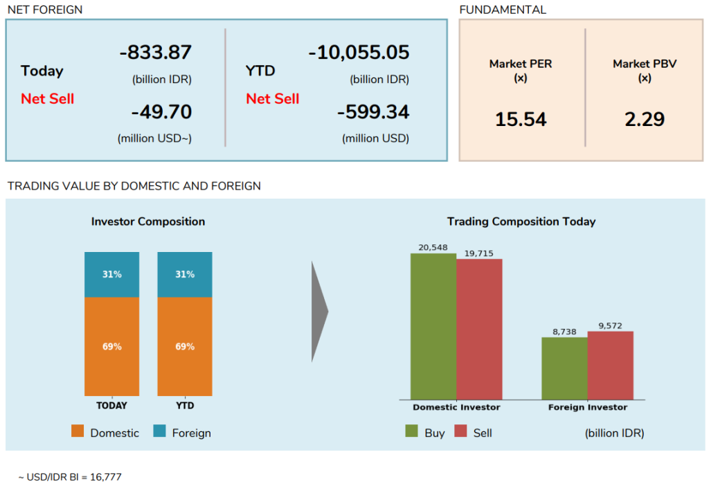 Value transaksi tercatat dengan nilai transaksi jumbo Rp29.35 triliun, relatif sama dibandingkan hari sebelumnya sebesar Rp29.17 triliun. Sebanyak 654 saham menguat, 108 saham melemah, dan 56 saham stagnan.