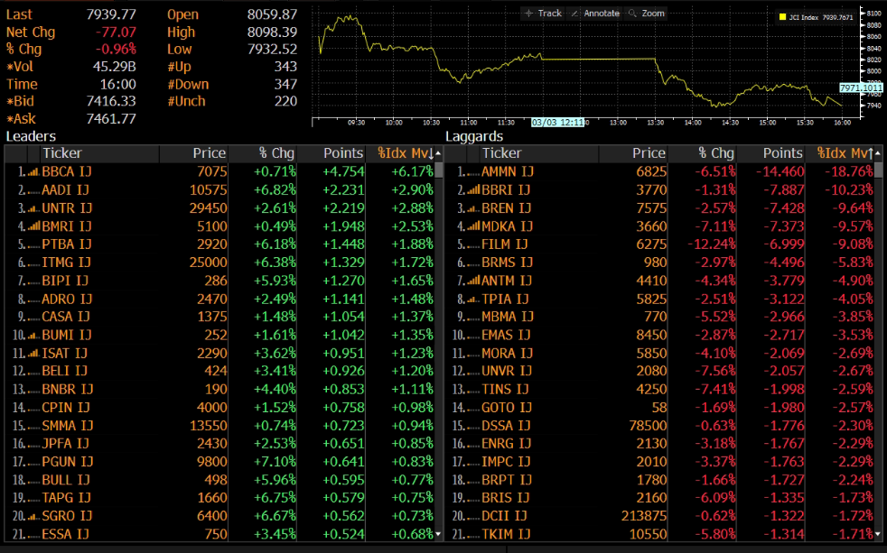 IHSG ditutup melemah 0.96% ke level 7,939 pada perdagangan Selasa (03/03). Indeks sempat rebound namun pada akhir sesi bergerak melemah hingga ditutup di zona merah. Pergerakan IHSG dibebani oleh saham AMMN, BBRI dan BREN.