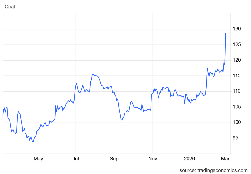 - Harga batu bara melonjak lebih dari 8% ke USD128 per ton, tertinggi sejak Desember 2024, setelah penghentian fasilitas LNG di Qatar akibat serangan drone Iran memicu fuel switching di Asia