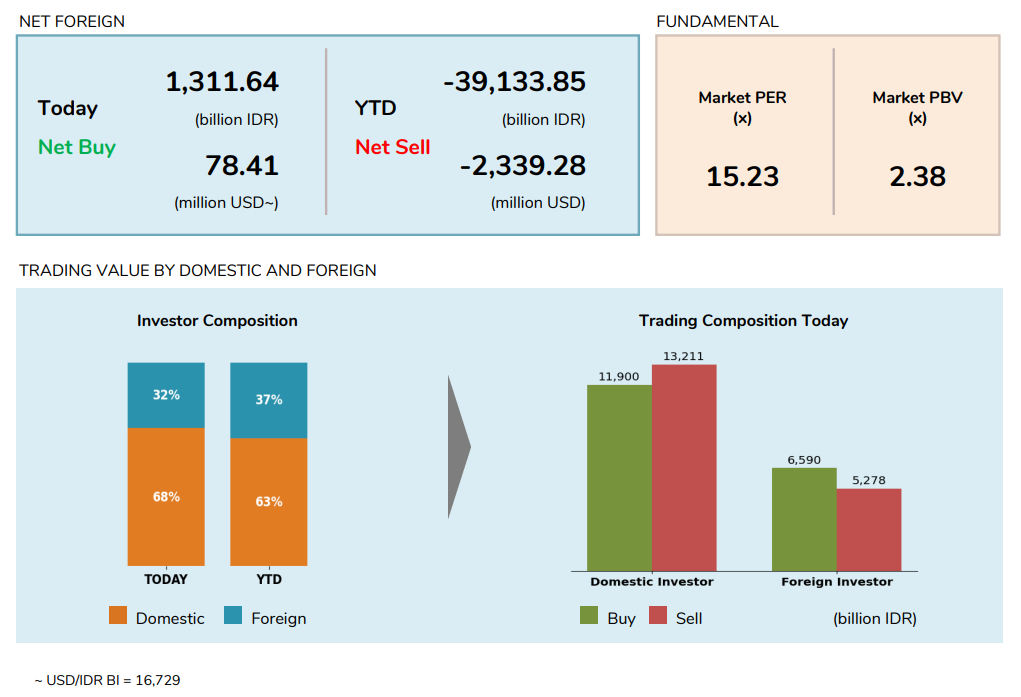 Value transaksi tercatat dengan nilai transaksi sebesar Rp18.51 triliun, lebih rendah dibandingkan hari sebelumnya sebesar Rp19.49 triliun. Sebanyak 284 saham menguat, 357 saham melemah, dan 168 saham stagnan.