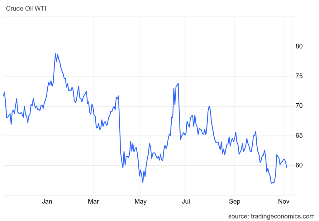 Harga minyak WTI turun 1.5% ke level USD59.6/barel, dibebani oleh sentimen kelebihan pasokan.Kenaikan produksi dari negara-negara OPEC+ dan non-anggota memicu kekhawatiran akan kelebihan pasokan global di tengah lesunya permintaan.