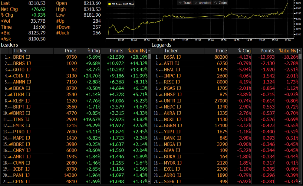 IHSG ditutup menguat 0.93% ke level 8,318 pada perdagangan Rabu (05/11). IHSG ditutup menguat ditengah rilis data BPS yang mengumumkan angka pertumbuhan ekonomi Indonesia kuartal III-2025 sebesar 5.04%.