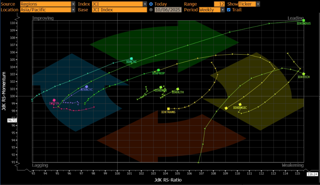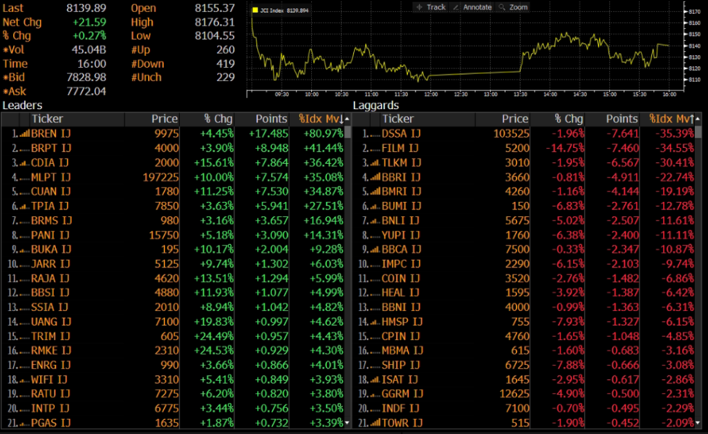 IHSG ditutup menguat 0.27% ke level 8,140 pada perdagangan Senin (06/10). Indeks bergerak volatil dengan range pergerakan 8,104 - 8,176. Indeks sektoral bergerak mixed dengan kenaikan paling besar ada pada sektor teknologi (+2.36%) dan penurunan terendah sektor industrial (-1.53%).