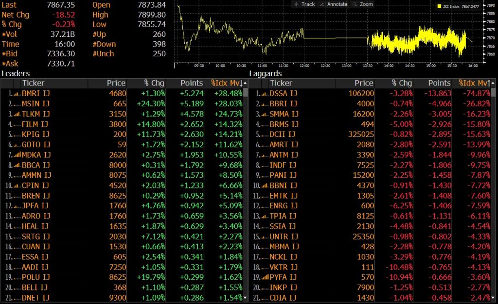 IHSG ditutup melemah 0.23% ke level 7,867 pada perdagangan Kamis (04/09). Indeks sempat berada di zona hijau namun akhirnya melemah dan sempat sentuh level lowest 7,856. Mayoritas indeks sektoral mengalami pelemahan selain sektor consumer cyclical dan transportasi yang menguat masing-masing 3.61% dan 0.09%