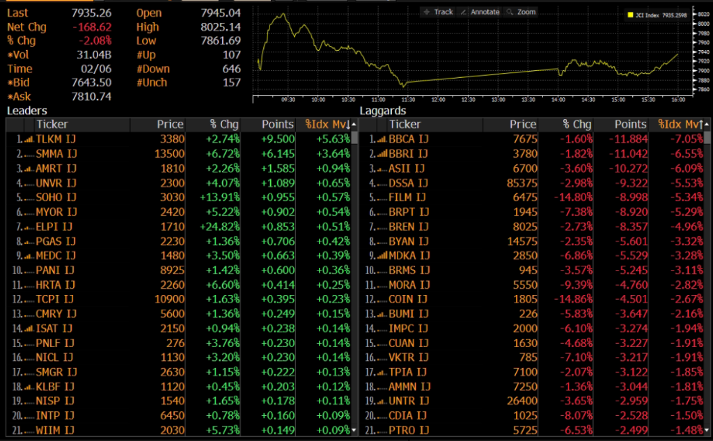 IHSG ditutup melemah 2.08% ke level 7,935 pada perdagangan Jumat (06/02). Indeks solid bergerak di zona merah hingga akhir perdagangan. Pelemahan IHSG dibebani oleh saham BBCA, BBRI, dan ASII.