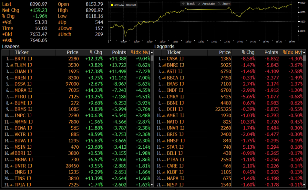 IHSG ditutup menguat 1.96% ke level 8,291 pada perdagangan Rabu (11/02). Indeks solid bergerak di zona hijau dan berhasil ditutup di level tertinggi 8,292. Penguatan IHSG didorong oleh saham BRPT, TLKM, dan CUAN.