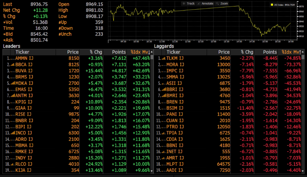 IHSG ditutup naik 0.13% ke level 8,936 pada perdagangan Jumat (09/01). Indeks bergerak volatil dengan range 8,969 - 8,981. Penguatan IHSG didorong oleh saham AMMN, BBCA, dan BUVA.