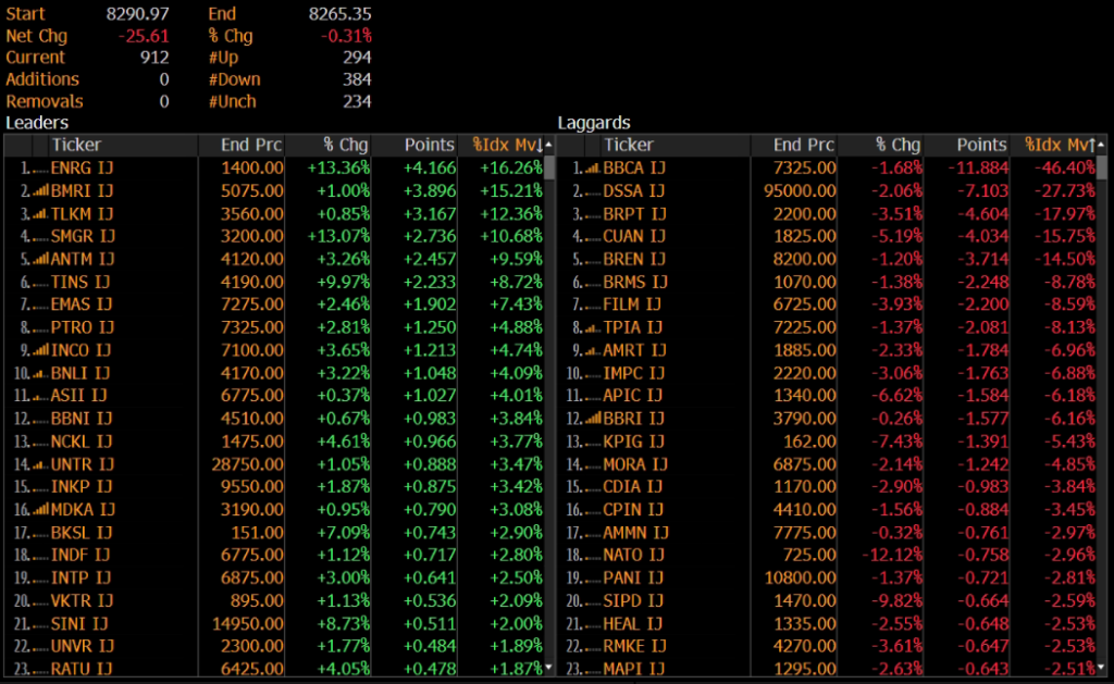 IHSG ditutup melemah 0.31% ke level 8,265 pada perdagangan Kamis (12/02). Indeks koreksi pasca kenaikan 3 hari beruntun. Pelemahan IHSG dibebani oleh saham BBCA, DSSA, dan BRPT.