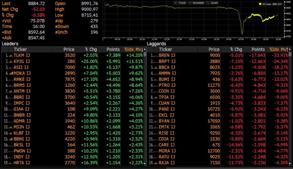 IHSG ditutup turun 0.58% ke level 8,885 pada perdagangan Senin (12/01). Indeks beregraak volatil dan sempat anjlok ke level 8,715 hingga akhirnya rebound terbatas. Pelemahan IHSG dibebani oleh saham BREN, BRPT, dan BBCA.