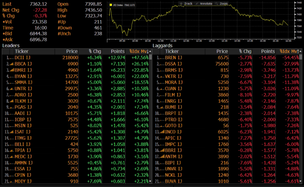 IHSG ditutup melemah 0.37% ke level 7,362 pada perdagangan Kamis (12/03). Indeks bergerak volatil dengan range perdagangan 7,324 - 7,436. Pelemahan IHSG dibebani oleh saham BREN, DSSA, dan BRMS.