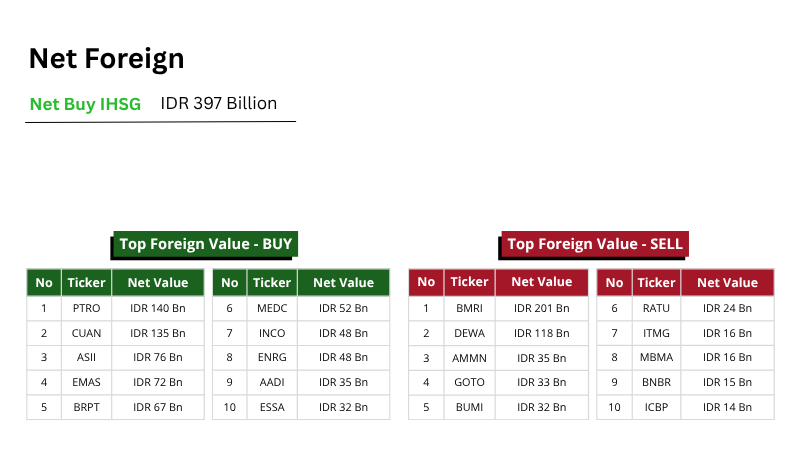 Dari sisi aktivitas, nilai transaksi tercatat sebesar Rp20.44 triliun, meningkat dibandingkan hari sebelumnya sebesar Rp18.09 triliun. Sebanyak 397 saham menguat, 264 saham melemah, dan 156 saham stagnan.