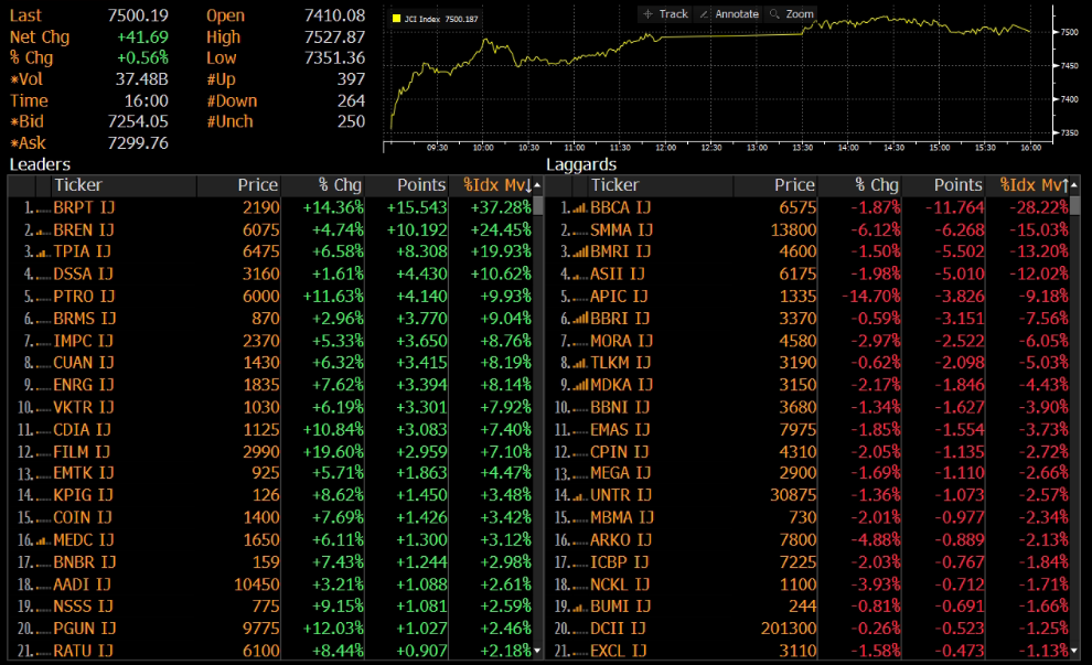 IHSG ditutup menguat 0.56% ke level 7,500 pada perdagangan Senin (13/04). Indeks sempat dibuka di zona merah namun berhasil rebound ke zona hijau hingga akhir sesi. Penguatan indeks ditopang oleh saham BRPT, BREN, dan TPIA.