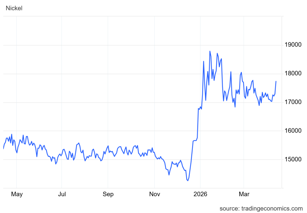 - Harga nikel naik ke sekitar $17,200/ton didorong pemangkasan kuota Indonesia dan disiplin produksi 2026 (RKAB 190โ200 juta ton), yang memperkuat sentimen meski pasar masih oversupply.
