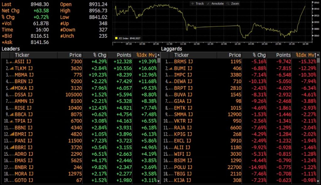IHSG ditutup naik 0.72% ke level 8,948 pada perdagangan Selasa (13/01). Indeks bergerak volatil dengan range pergerakan 8,841 - 8,957 hingga akhirnya berhasil ditutup di zona hijau. Penguatan IHSG didorong oleh saham ASII, TLKM, dan MBMA.