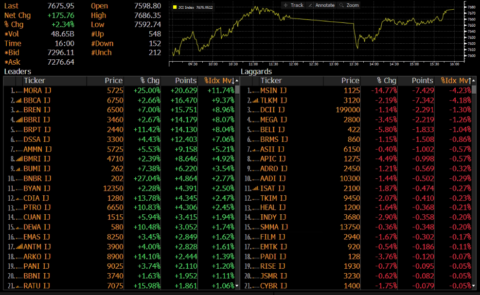 IHSG ditutup menguat 2.34% ke level 7,676 pada perdagangan Selasa (14/04). Indeks solid bergerak di zona hijau dengan range perdagangan 7,593 - 7,686. Penguatan indeks ditopang oleh saham BBRI, BBCA, dan BRPT.