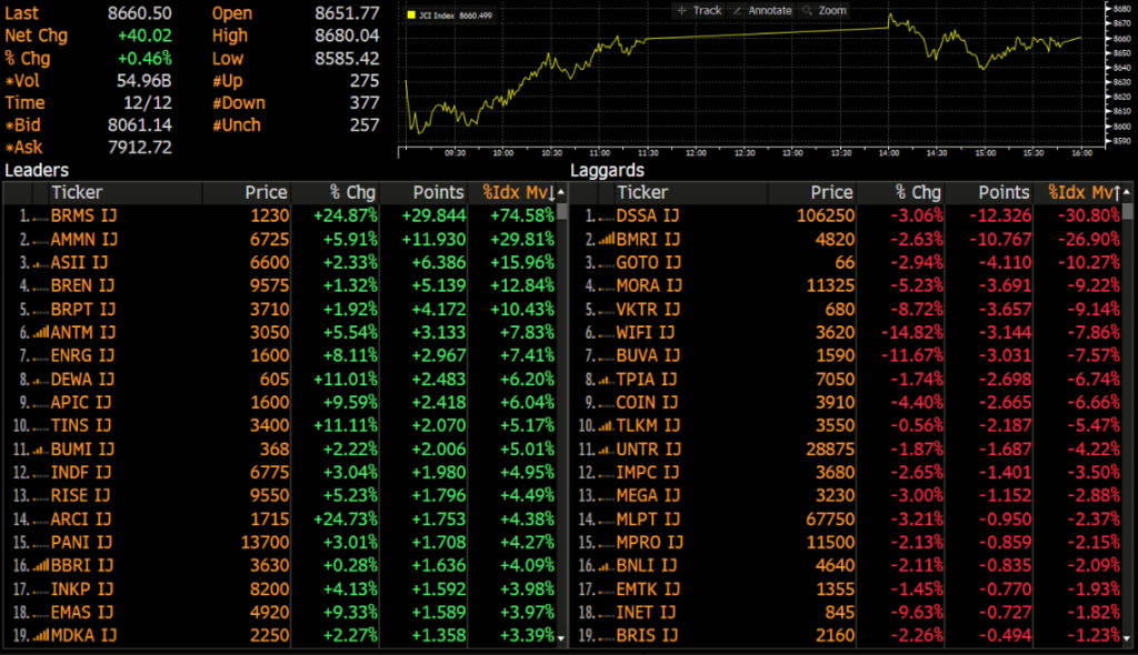 IHSG ditutup menguat 0.46% ke level 8,660 perdagangan Jumat (12/12). Indeks sempat sentuh di zona merah namun berhasil menguat hingga akhir sesi perdagangan di zona hijau. Penguatan IHSG didorong oleh saham BRMS, AMMN, dan ASII.