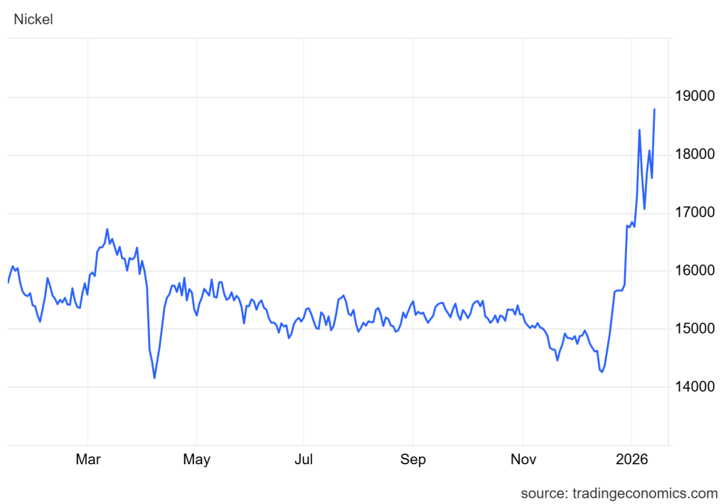 Harga nikel melonjak 6.7% ke sekitar USD 18,785/ton, didorong oleh pulihnya permintaan China dan potensi pemotongan pasokan 34% dari Indonesia untuk 2026 meski kuota final belum ditetapkan.