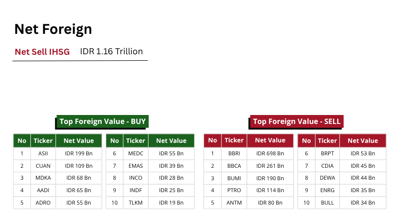 Dari sisi aktivitas, nilai transaksi tercatat sebesar Rp22.44 triliun, lebih rendah dibandingkan hari sebelumnya sebesar Rp24.85 triliun. Sebanyak 292 saham melemah, 380 saham menguat, dan 149 saham stagnan.
