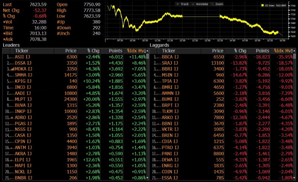 IHSG ditutup melemah 0.68% ke level 7,623 pada perdagangan Rabu (15/04). Indeks bergerak volatil dan sempat dibuka di zona merah dengan level highest 7,774. Pelemahan Indeks dibebani oleh saham BBCA, SRAJ, dan BBRI.
