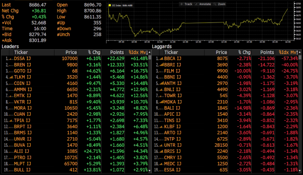 IHSG ditutup menguat 0.43% ke level 8,686 perdagangan Selasa (16/12). Indeks bergerak volatil dengan range perdagangan 8,697-8,701. Penguatan IHSG didorong oleh saham DSSA, BREN, dan GOTO.