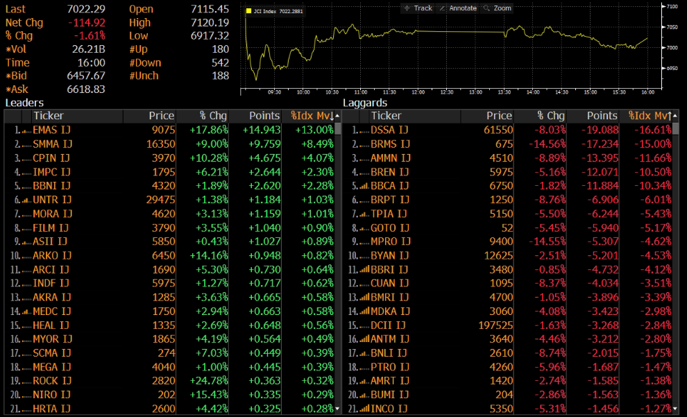 IHSG ditutup anjlok 1.61% ke level 7,022 pada perdagangan Senin (16/03). Indeks tercatat koreksi 4 hari beruntun menjelang libur lebaran. Pelemahan IHSG dibebani oleh saham DSSA, BRMS, dan AMMN.