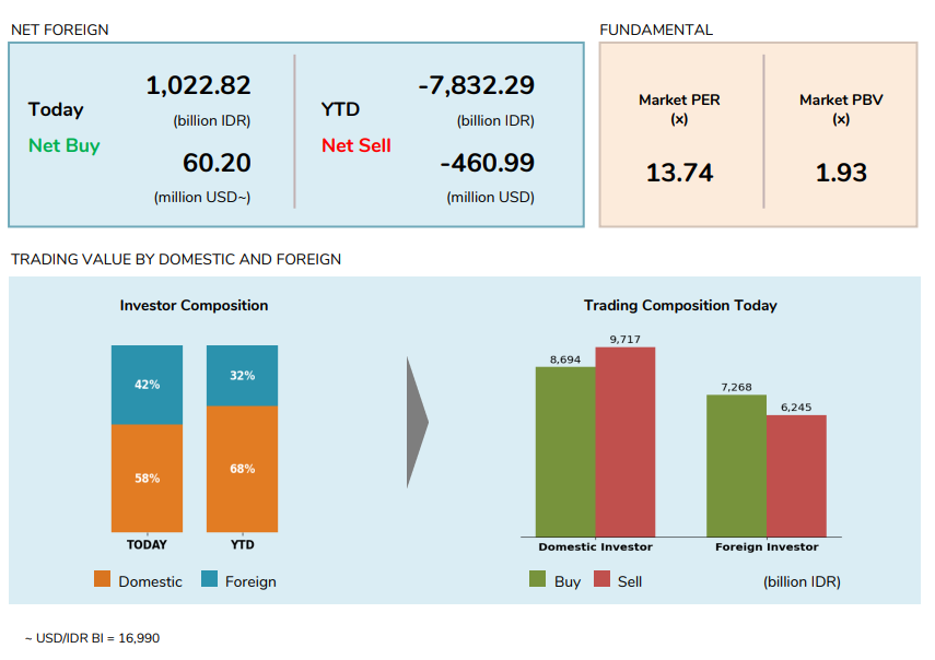 Value transaksi tercatat sebesar Rp15.91 triliun, lebih tinggi dibandingkan hari sebelumnya sebesar Rp13.69 triliun. Sebanyak 542 saham melemah, 180 saham menguat, dan 98 saham stagnan.