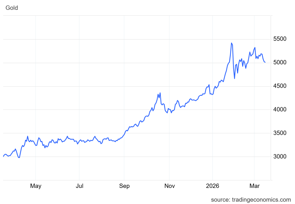 • Harga Emas melemah mendekati 5,000/oz karena turunnya harga energi dan pelemahan tipis dolar AS meredam permintaan safe-haven di tengah konflik Timur Tengah.