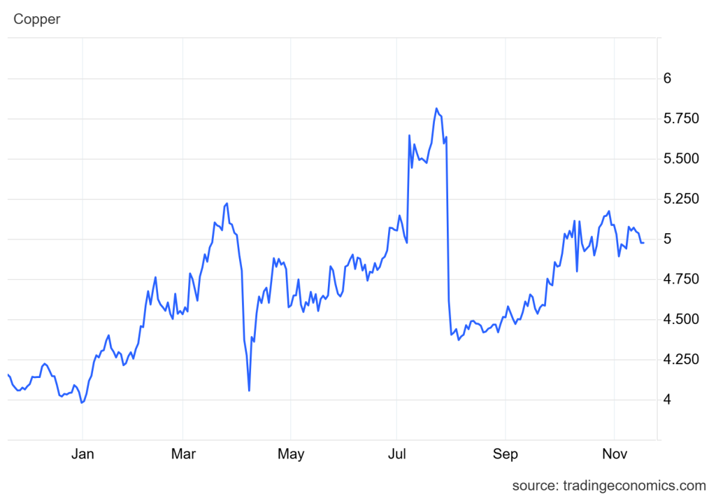 Harga tembaga turun 1.2% ke level USD5/pon, level terendah dalam lebih dari satu minggu. China menargetkan adanya pengawasan yang lebih ketat terhadap industri pemurnian tembaga.