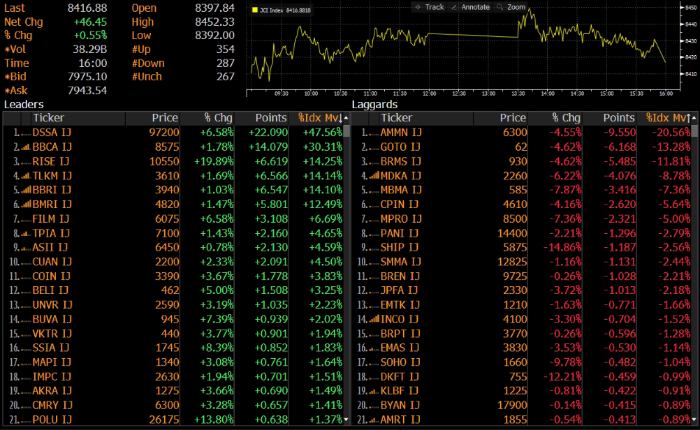 IHSG ditutup menguat 0.55% ke level 8,417 pada perdagangan Senin (17/11). Indeks solid bergerak di zona hijau hingga ditutup di atas level psikologis 8,400. Indeks bergerak beragam dengan penguatan tertinggi sektor properti (+2.41%) dan pelemahan terendah sektor basic industrial (-2.06%)