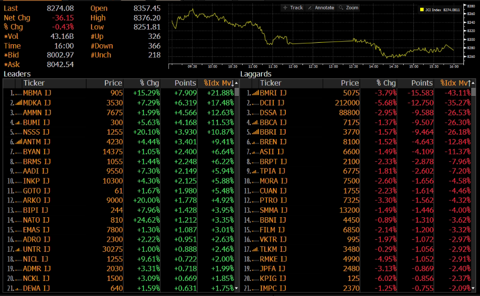 IHSG ditutup melemah 0.43% ke level 8,274 pada perdagangan Kamis (19/02). Indeks sempat bertahan di zona hijau namun berbalik arah hingga akhir sesi perdagangan. Pelemahan IHSG dibebani oleh saham BMRI, DCII, dan DSSA.