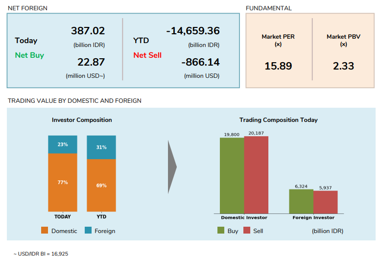 Value transaksi tercatat dengan nilai transaksi Rp26.24 triliun, lebih tinggi dibandingkan hari sebelumnya sebesar Rp25.33 triliun. Sebanyak 366 saham melemah, 326 saham menguat, dan 127 saham stagnan.