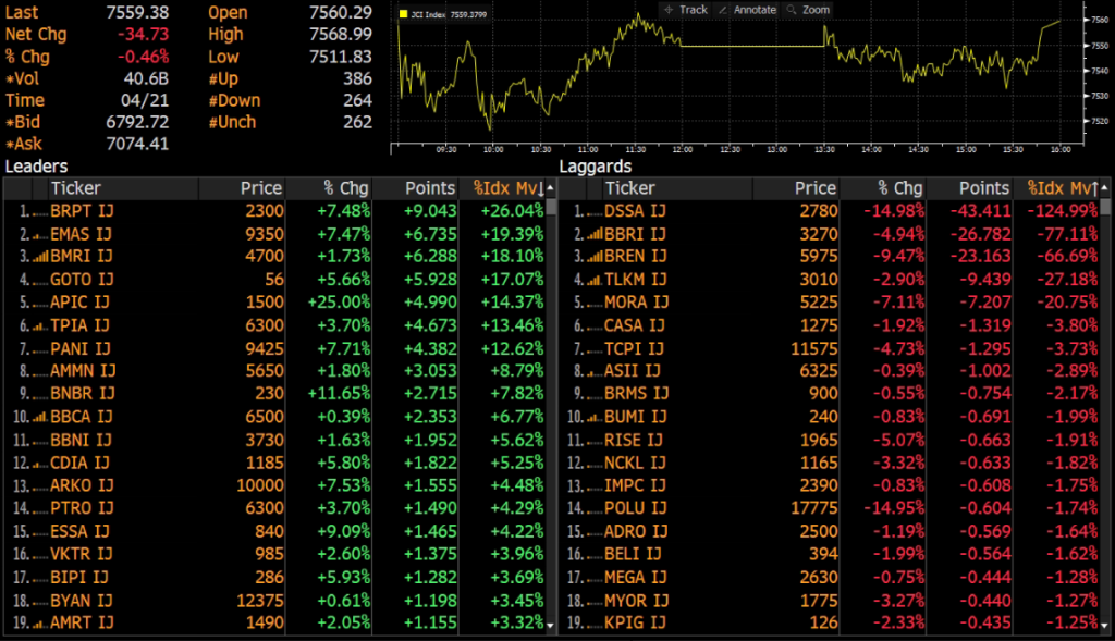 IHSG ditutup melemah 0.46% ke level 7,559 pada perdagangan Selasa (21/04). Indeks solid bergerak di zona merah dengan range pergerakan di level 7,511 - 7,568. Pelemahan Indeks dibebani oleh saham DSSA, BBRI, dan BREN.
