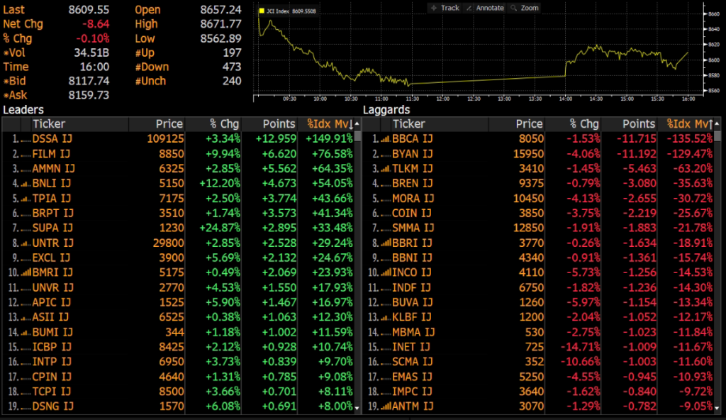 IHSG ditutup melemah 0.10% ke level 8,609 perdagangan Jumat (19/12). Indeks bergerak volatil dengan range perdagangan di level 8,563 - 8,672. Pelemahan IHSG dibebani oleh saham BBCA, BYAN, dan TLKM.