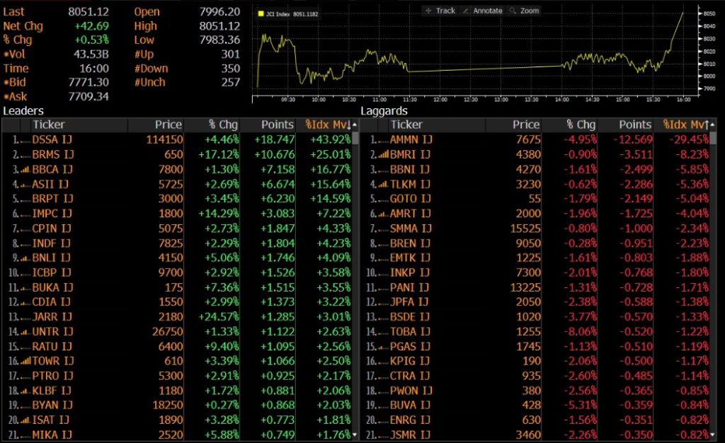 IHSG ditutup menguat 0.53% ke level 8,051 pada perdagangan Jumat (19/09). Indeks bergerak volatil dengan range pergerakan 7,983-8,051 hingga akhirnya ditutup di zona hijau. Penguatan IHSG didorong oleh kenaikan saham DSSA, BRMS, dan BBCA.