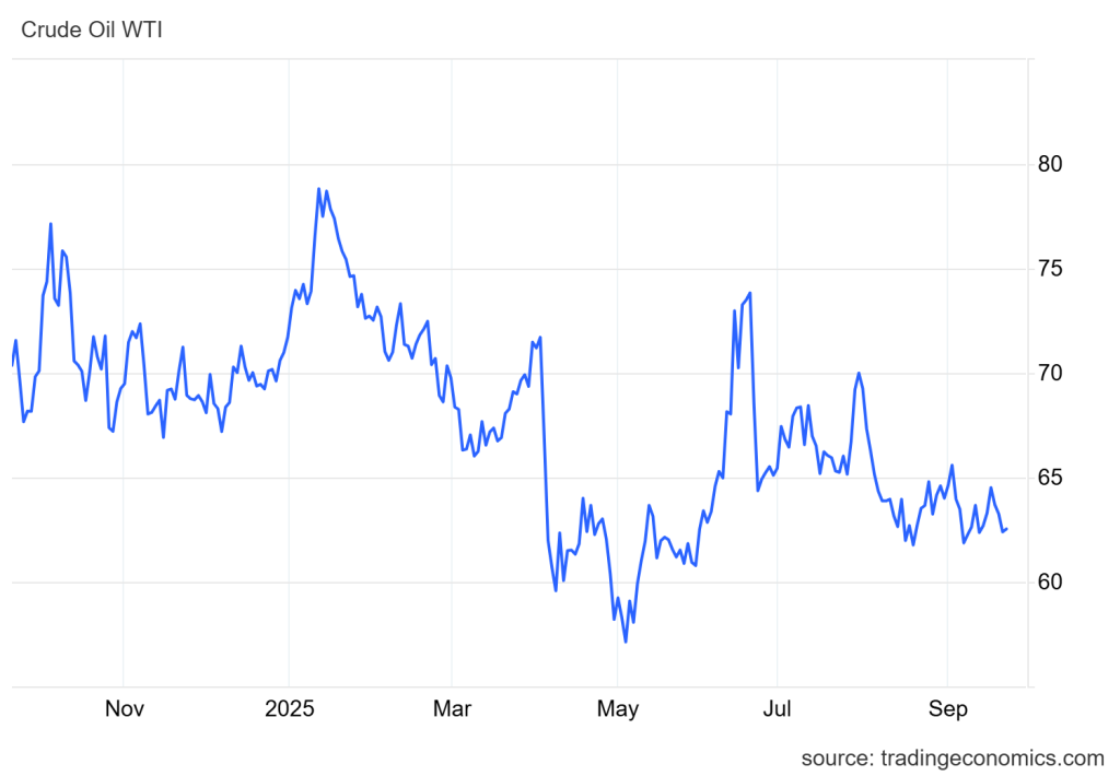 Minyak Mentah WTI turun 1.4% ke $62.70 per barel pada Jumat (19/09), tertekan pasokan melimpah, melemahnya permintaan, dan dolar yang menguat
