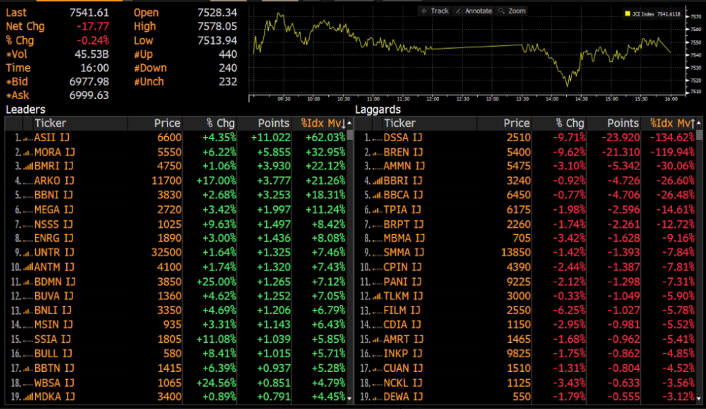 IHSG ditutup melemah 0.24% ke level 7,542 pada perdagangan Rabu(22/04). Indeks bergerak volatil dengan range perdagangan di level 7,514 - 7,578.. Pelemahan Indeks dibebani oleh saham DSSA, BREN, dan AMMN.