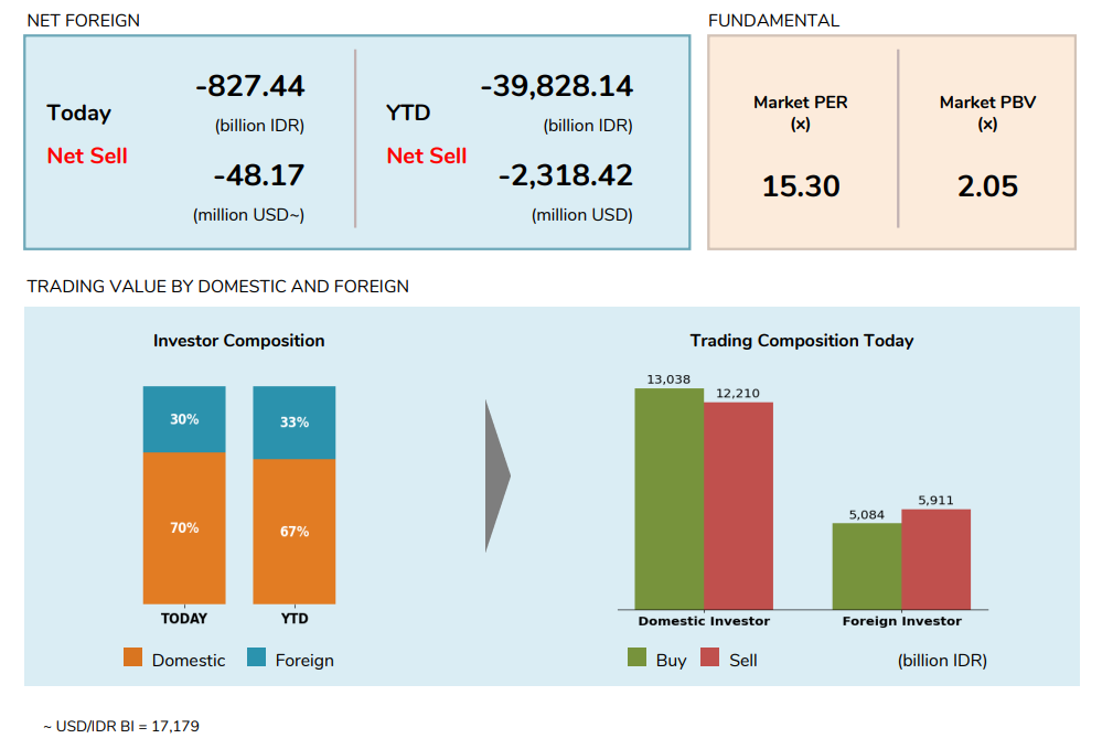Dari sisi aktivitas, nilai transaksi tercatat sebesar Rp18.15 triliun, lebih tinggi dibandingkan hari sebelumnya sebesar Rp17.71 triliun. Sebanyak 240 saham melemah, 440 saham menguat, dan 141 saham stagnan.