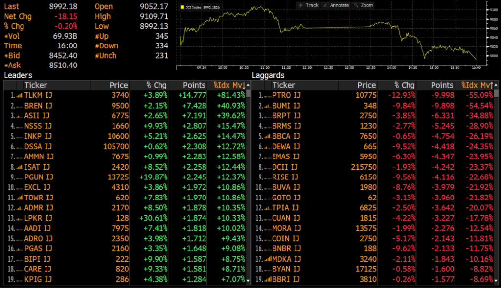 IHSG ditutup turun 0.20% ke level 8,992 pada perdagangan Kamis (22/01). Indeks sempat bertahan di zona hijau namun berakhir di zona merah dengan pelemahan terbatas. Pelemahan IHSG dibebani oleh saham PTRO, BUMI, dan BRPT.