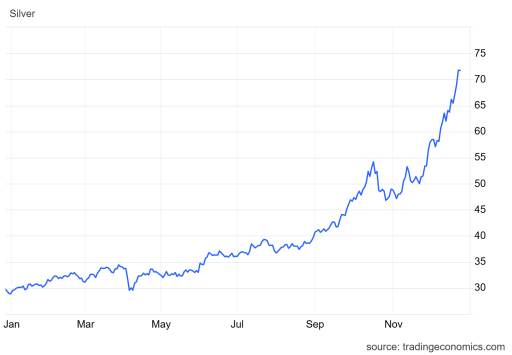 Harga perak melonjak ke level tertinggi sepanjang masa baru (ATH) ke level USD72/ons, naik 4% pada Selasa, didorong oleh meningkatnya permintaan di tengah ketatnya pasokan.