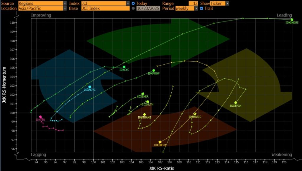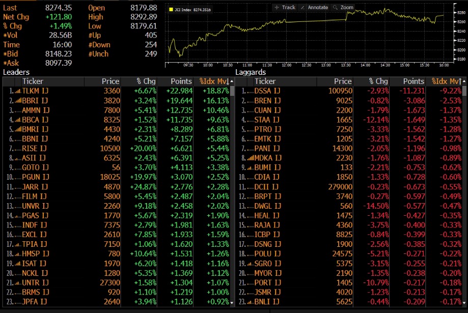 IHSG ditutup menguat 1.49% ke level 8,274 pada perdagangan Kamis (23/10). Indeks solid bergerak di zona hijau dan sempat sentuh level ATH 8,293. Seluruh indeks sektoral ditutup menguat dengan penguatan tertinggi berasal dari sektor properti (+3.65%), dan non cyclical (+2.07%)