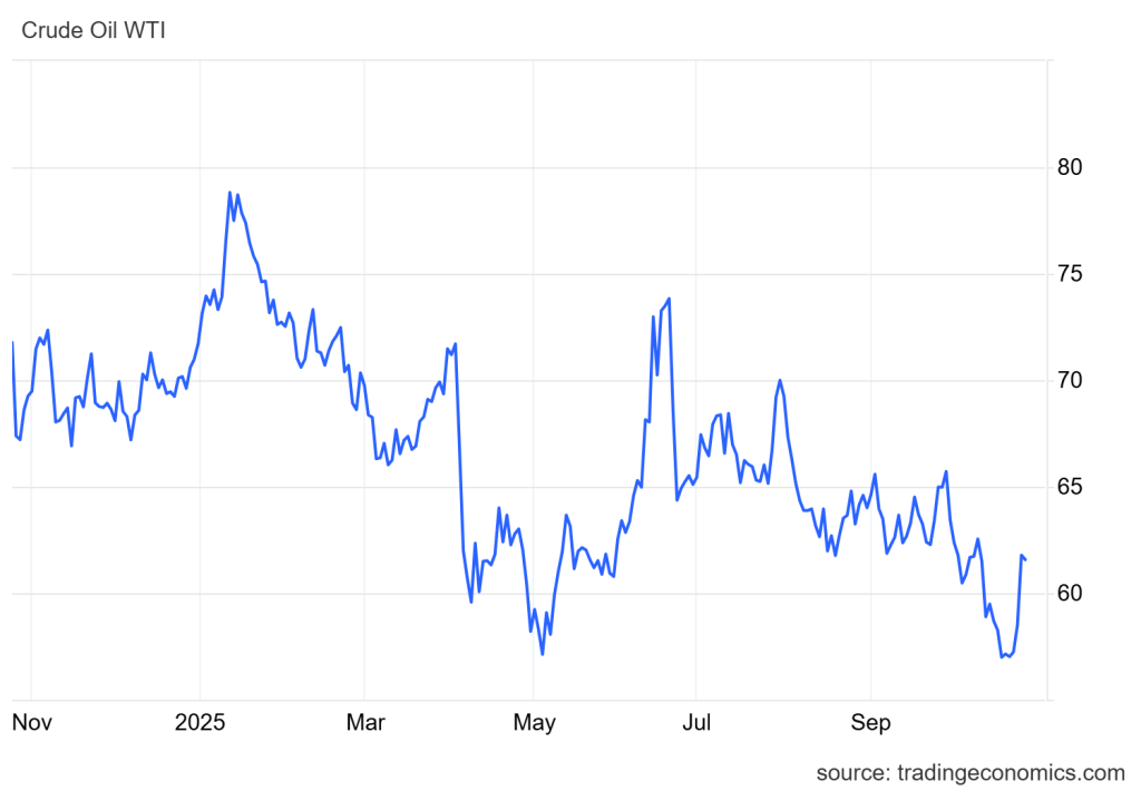 Harga minyak WTI kembali melonjak 5.6% ke level USD61.8/barel pada Kamis. Kenaikan ini didorong oleh sentimen AS yang mengumumkan sanksi baru terhadap dua perusahaan minyak terbesar Rusia, Rosneft dan Lukoil, untuk menekan Rusia agar bersedia berunding mencapai perdamaian dengan Ukraina.