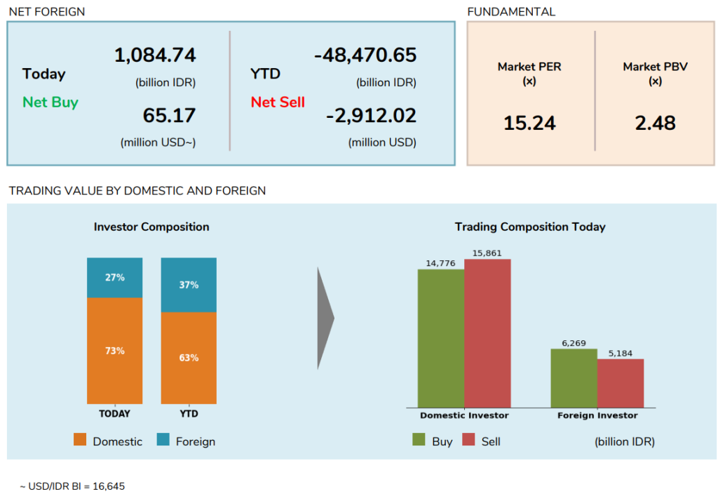 Value transaksi tercatat sebesar Rp21.06 triliun, lebih rendah dibandingkan hari sebelumnya sebesar Rp23.12 triliun. Sebanyak 405 saham menguat, 254 saham melemah, dan 152 saham stagnan.