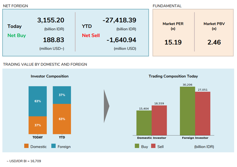 Value transaksi tercatat dengan nilai transaksi jumbo sebesar Rp45.65 triliun, lebih tinggi dibandingkan hari sebelumnya sebesar Rp16.47 triliun. Sebanyak 343 saham menguat, 297 saham melemah, dan 172 saham stagnan.
