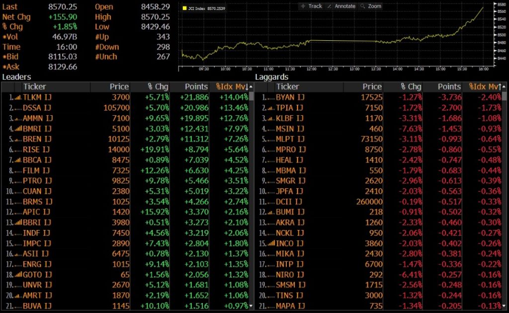 IHSG ditutup menguat 1.85% ke level All Time High 8,570 pada perdagangan Senin (24/11). Indeks solid bergerak di zona hijau dan berhasil ditutup di level tertingginya. Mayoritas indeks sektoral mengalami penguatan yang dipimpin oleh sektor properti (+3.93%) dan sektor consumer cyclical (+2.54%)