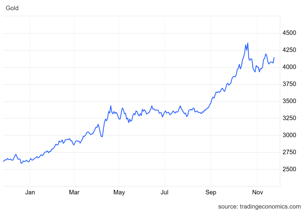 Harga emas naik 2% ke level USD4,144/ons pada Senin, rebound setelah terjadi penurunan sebelumnya. Sentimen datang dari probabilitas pemangkasan suku bunga di Desember yang meningkat menjadi 80%, setelah adanya pidato dari beberapa pejabat The Fed.