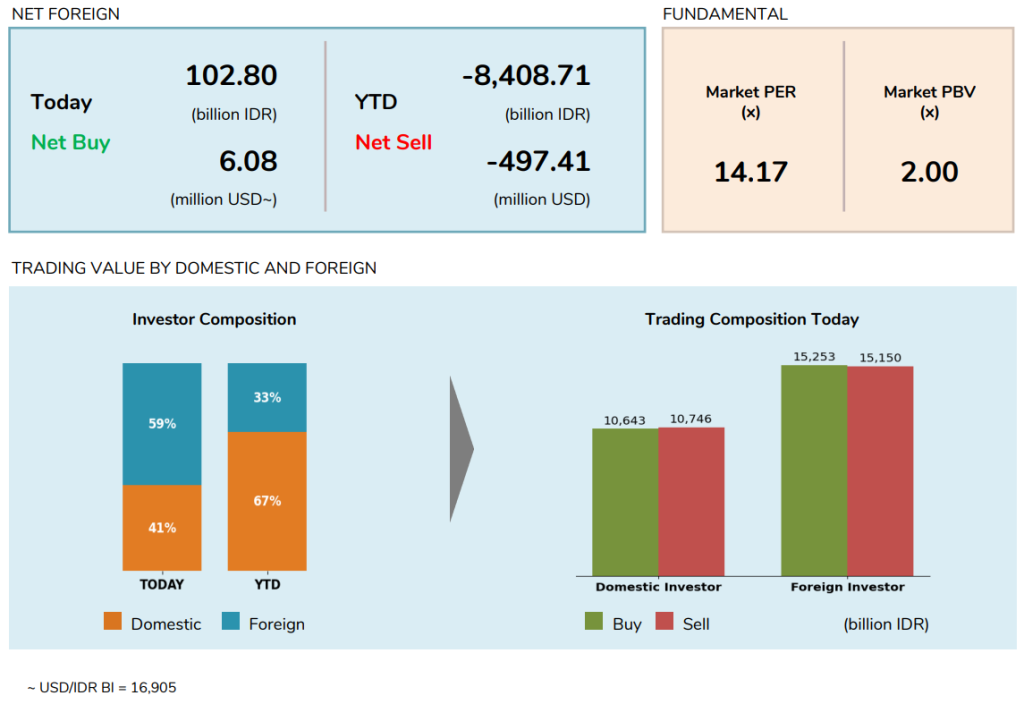 Value transaksi tercatat sebesar Rp25.92 triliun, lebih tinggi dibandingkan hari sebelumnya sebesar Rp23.88 triliun. Sebanyak 574 saham menguat, 148 saham melemah, dan 101 saham stagnan.
