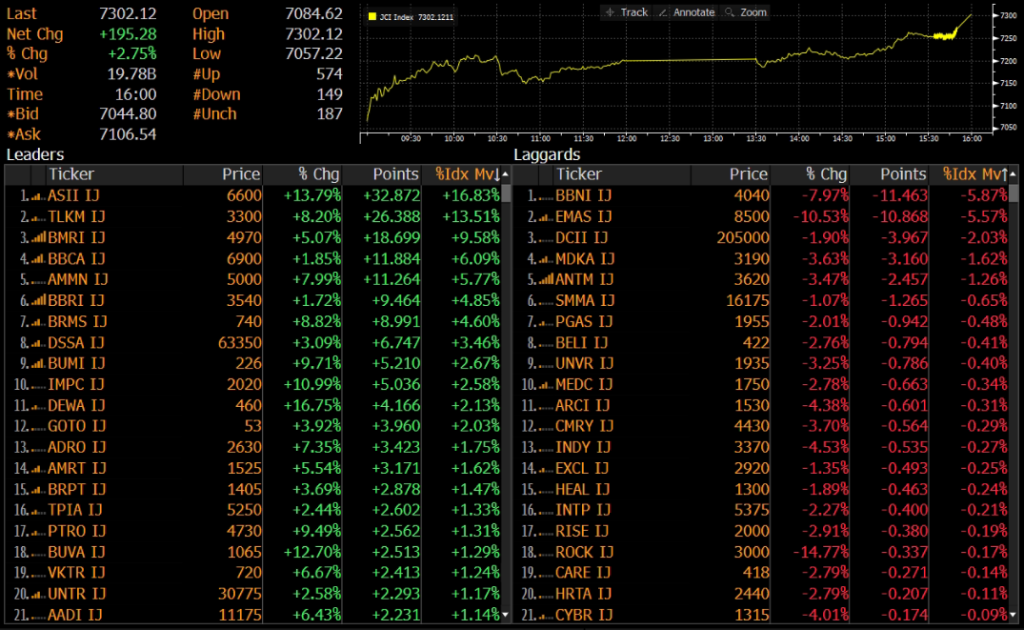 IHSG ditutup menguat 2.75% ke level 7,302 pada perdagangan Rabu (25/03) mengekor pergerakan bursa Regional yang juga kompak menguat. Penguatan IHSG didorong oleh saham ASII, TLKM, dan BMRI.
