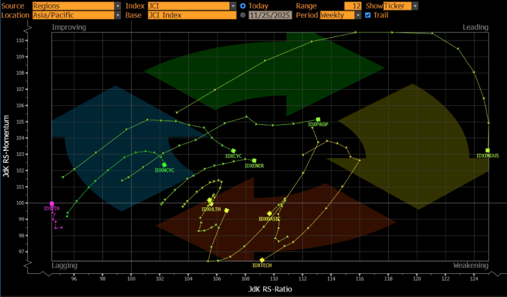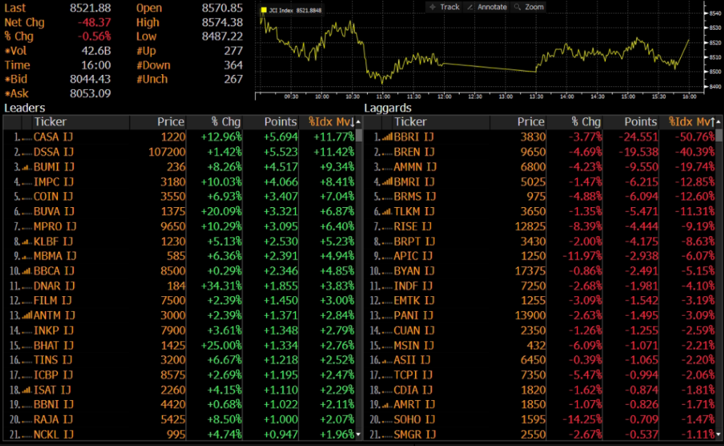 IHSG ditutup melemah 0.56% ke level 8,521 pada perdagangan Selasa (25/11). Indeks solid bergerak di zona merah pasca menyentuh ATH pada perdagangan sebelumnya. Indeks sektoral bergerak beragam dengan penguatan yang dipimpin oleh sektor industrial (+3.10%) dan pelemahan dari sektor properti (-0.94%)